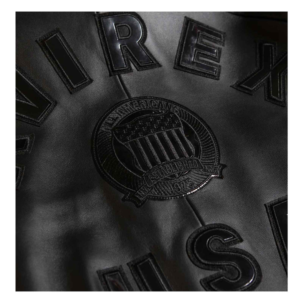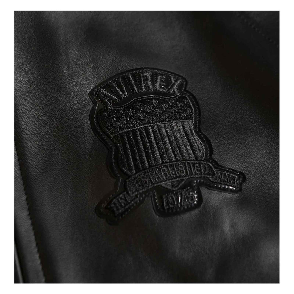 Featuring signature Avirex logo detailing on the collar and chest, this authentic leather flight jacket captures the spirit of aviation with every stitch. The front zipper with custom Avirex hardware, along with the striped ribbed hem and cuffs, adds a classic bomber silhouette with a modern edge.