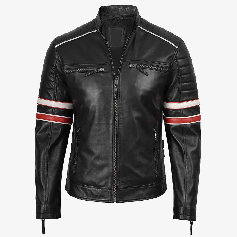 Featuring bold red and white dual racing stripes, padded shoulders, a mandarin collar, and multiple zippered pockets, it delivers a sharp moto-inspired look that’s perfect for both riding and everyday wear. Whether you’re on the bike or out in the city, this jacket ensures you always make a statement.
