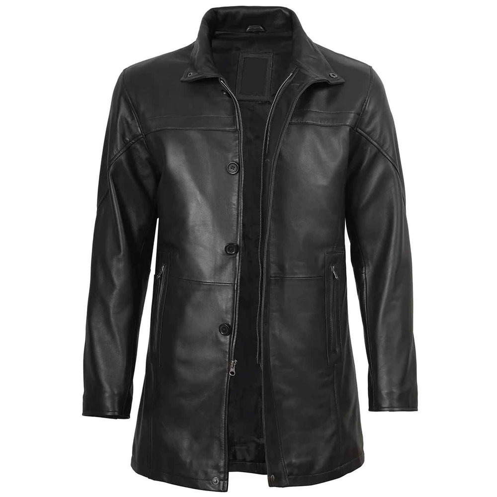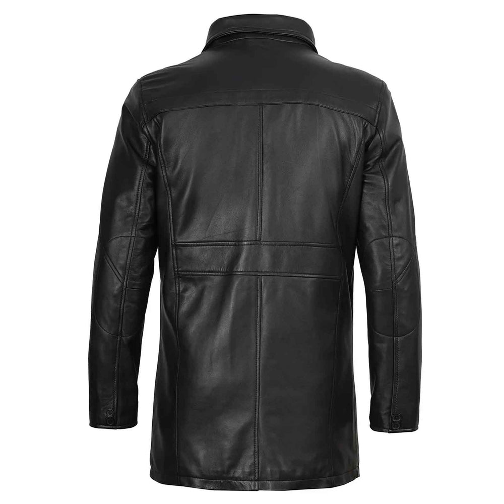 Designed with an adjustable collar and multiple internal and external pockets, it combines classic fashion with modern practicality. The smooth texture, premium stitching, and sleek black finish make this leather coat an ideal choice for men who value sophistication and style.