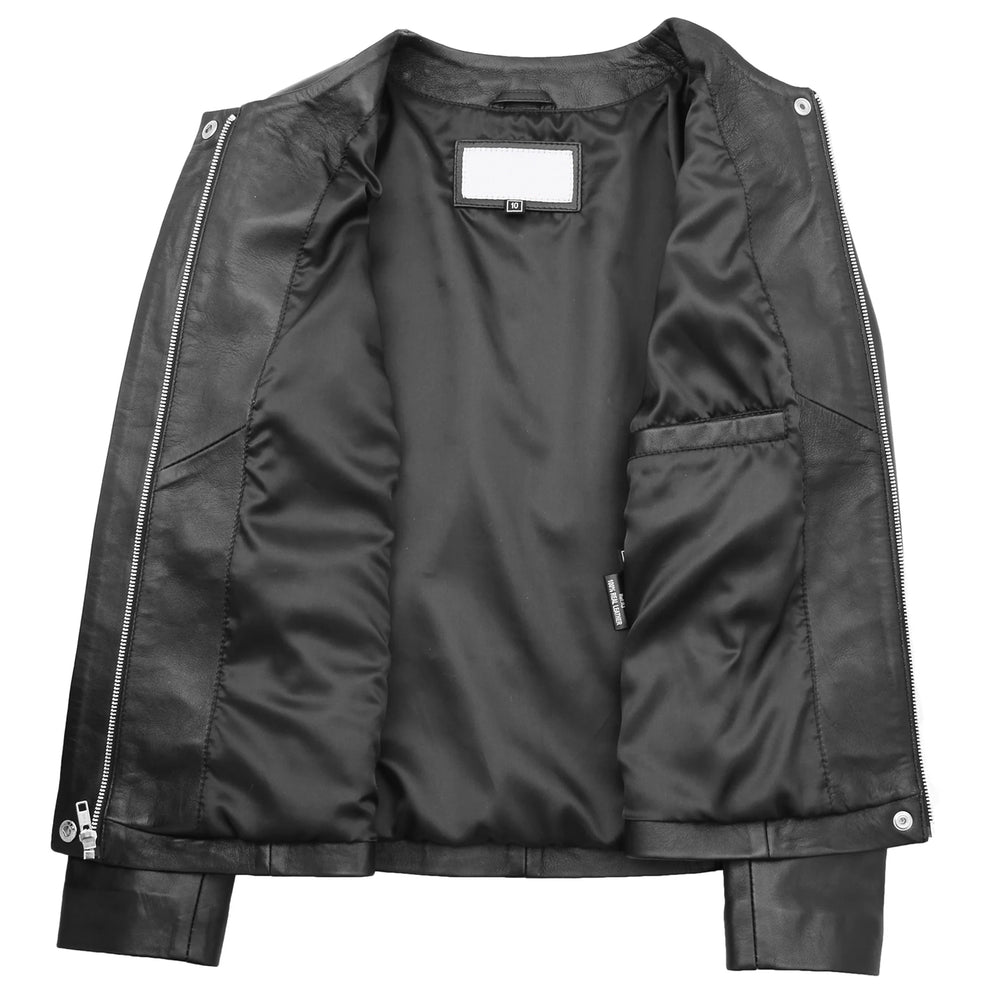 Discover timeless elegance with the Women’s Collarless Leather Jacket by Regals Leather — a simple yet sophisticated piece crafted from premium soft-touch sheep nappa leather. This minimalist design delivers effortless style and comfort, perfect for both casual and smart occasions.