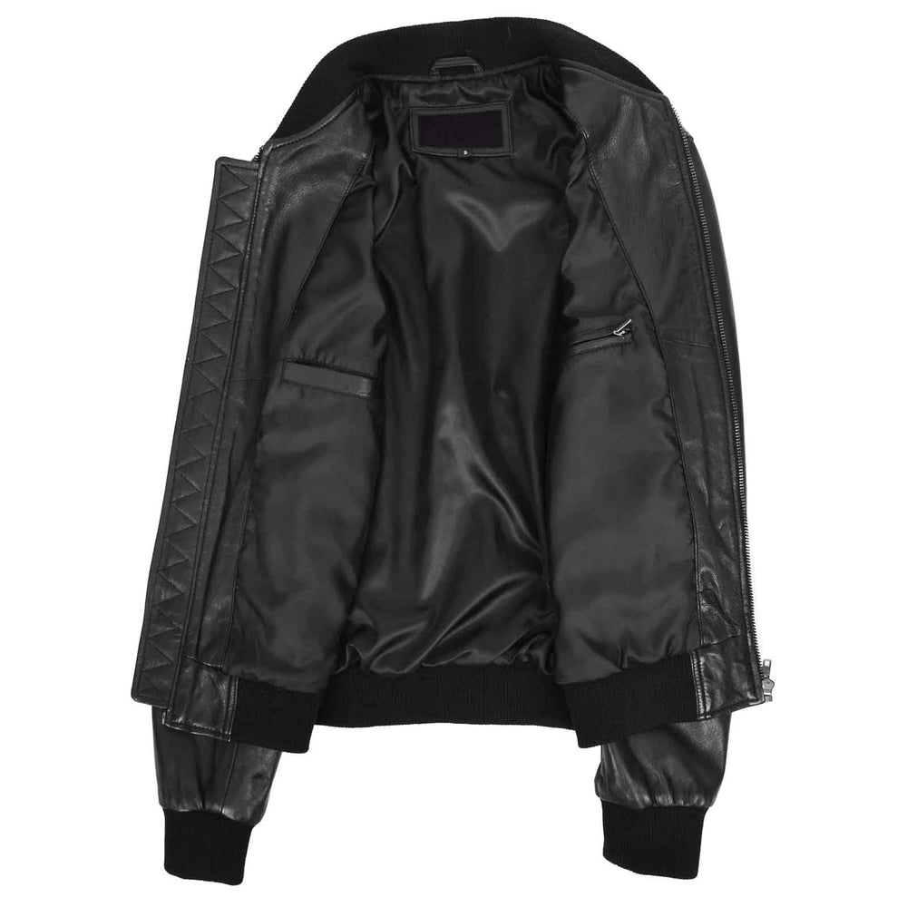 Inside, the lightweight polyester lining ensures breathability and comfort, making it ideal for year-round wear. Whether paired with jeans for a casual day out or styled for a night in the city, this black leather bomber jacket is the perfect statement piece for any wardrobe.