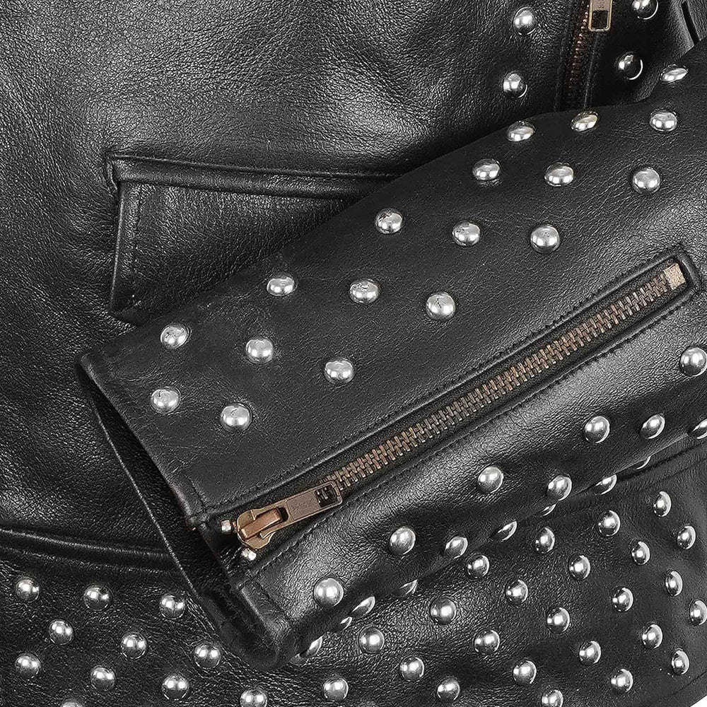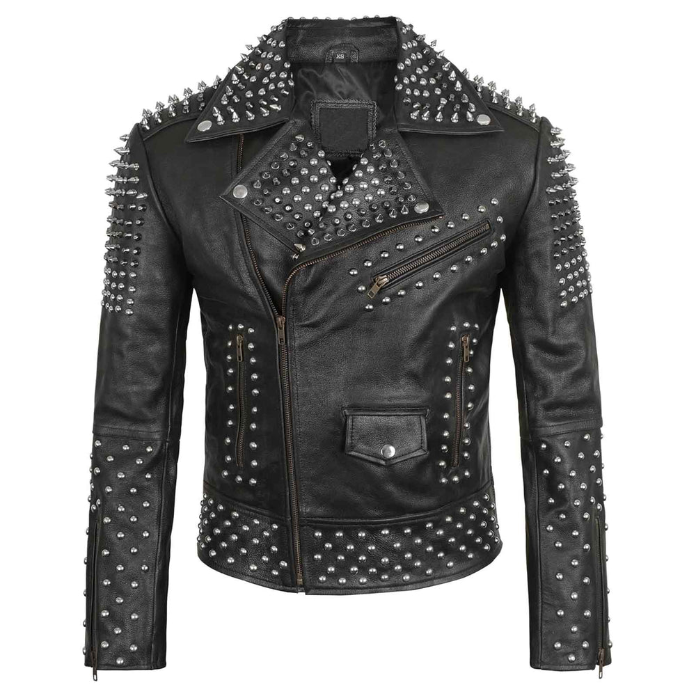 Expertly handcrafted from 100% genuine cowhide leather, this jacket features a classic lapel collar accentuated with hand-punched spike studs for an iconic rock and steampunk-inspired look.