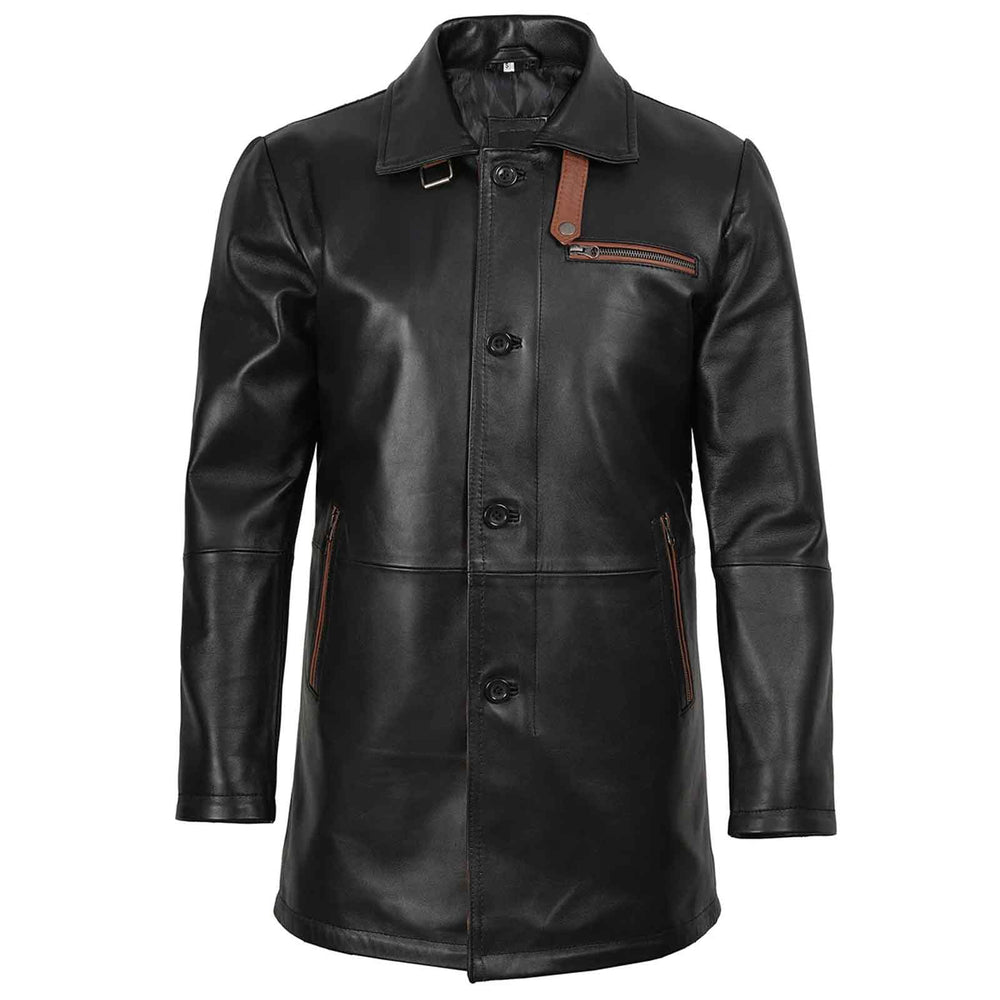 Refine your outerwear collection with this men’s black leather car coat, a perfect blend of modern sophistication and everyday practicality. Crafted from 100% real lambskin leather, this sleek coat offers a smooth, premium finish that elevates both casual and smart outfits. Its clean silhouette, functional storage, and adjustable belted collar make it an ideal choice for men who value style, comfort, and durability.