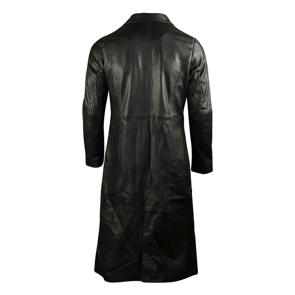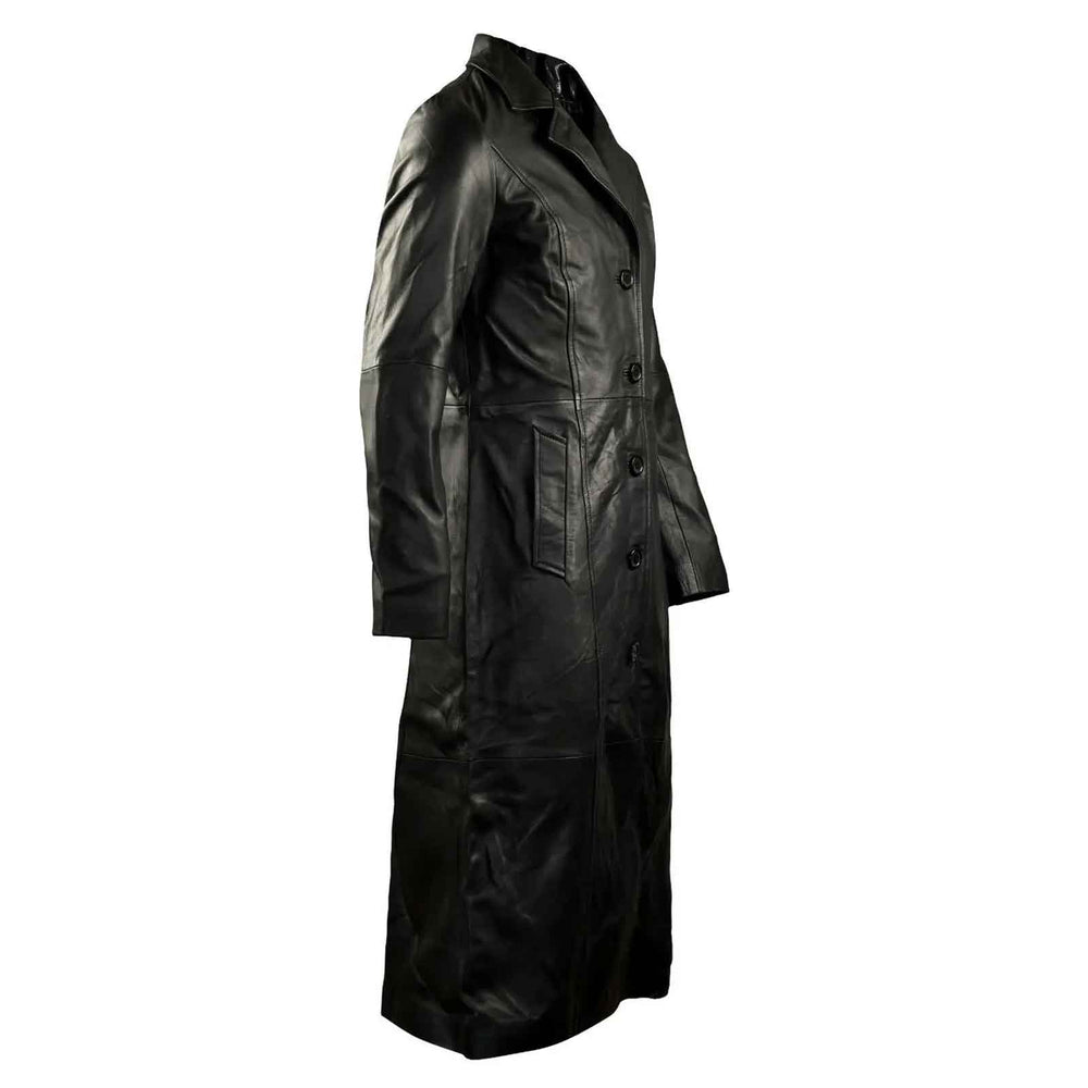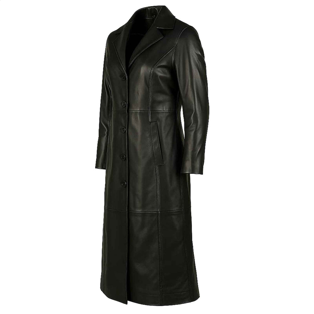 Featuring a classic tailored fit, this full-length leather overcoat is designed with a sleek button-up front, notched lapel collar, and practical side pockets—combining functionality with everyday sophistication.