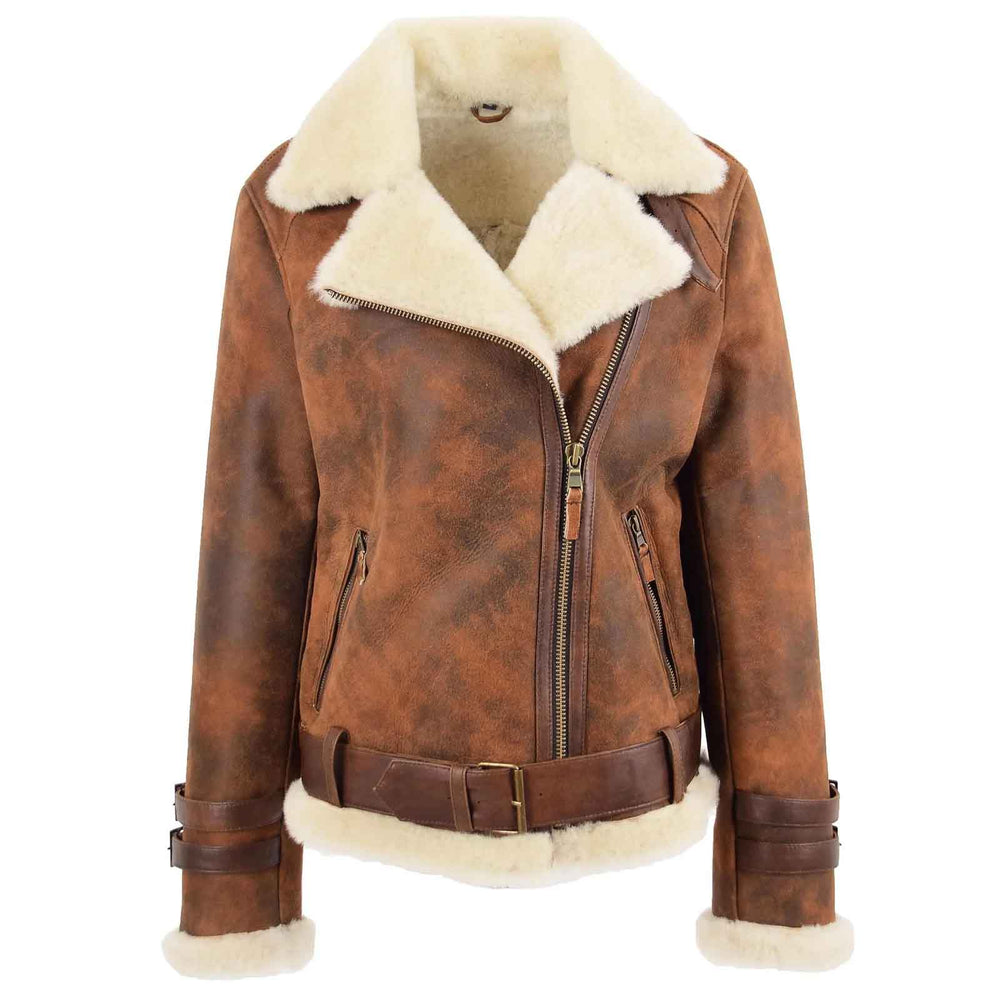 Designed with a cross-zip front fastening, this aviator jacket offers a flattering fit and a distinctive biker-inspired silhouette. It includes two outer zip pockets, adjustable buckle straps, and foldable cuffs that reveal the plush sheepskin lining.